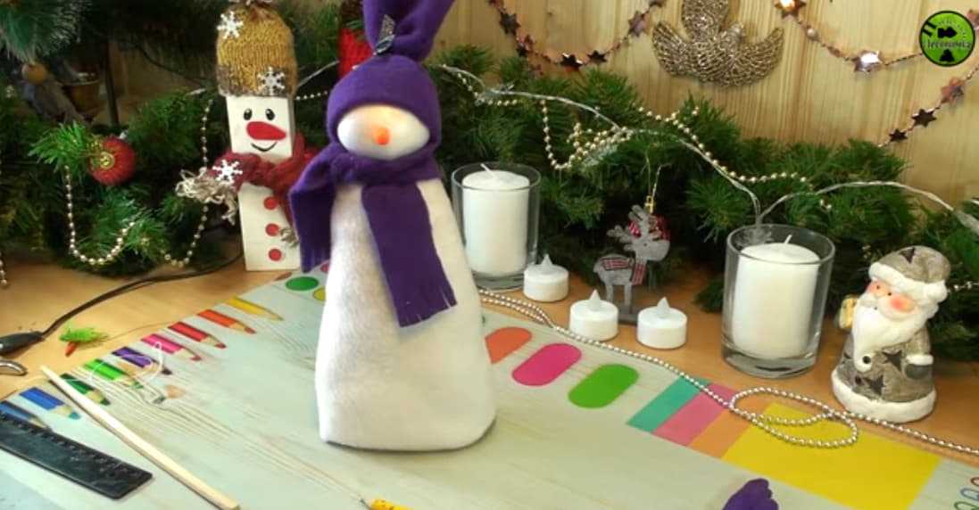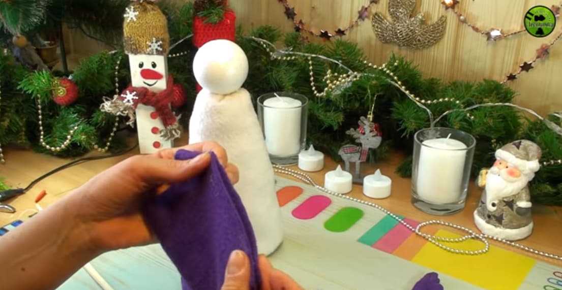 Сверните просто материал конусом и приклейте к голове. Из такого материала сделайте рот, приклеив его к голове. Из трикотажной ткани делаем наряд снеговику – варежки, шарф, шапку.