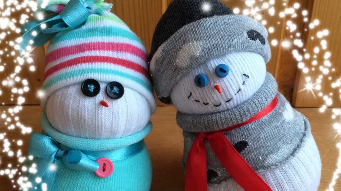 Красивые и пухлые снеговики получаются из носков. Таких снежных человечков можно посадить под елочку или украсить ними дом.