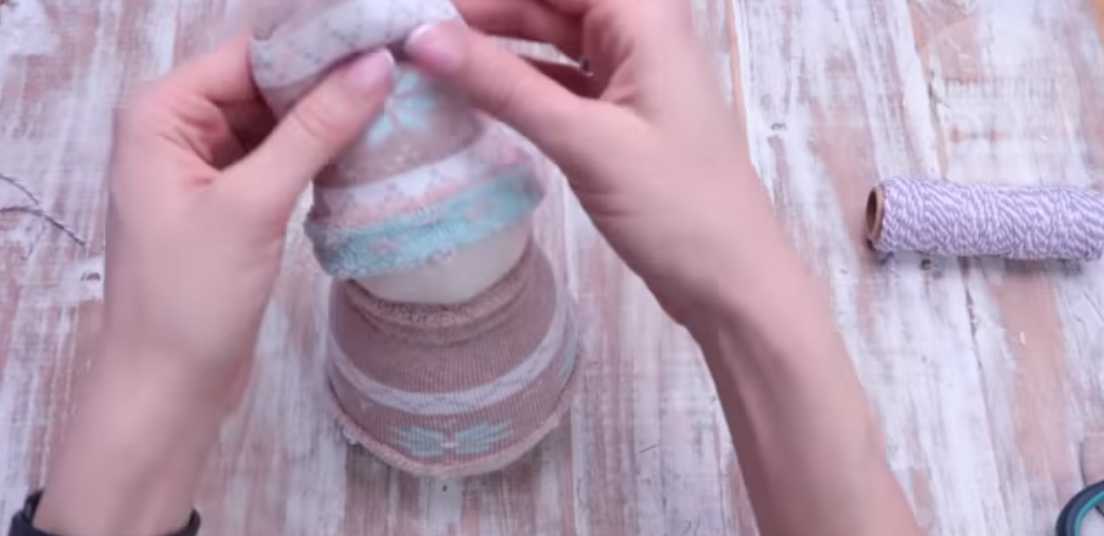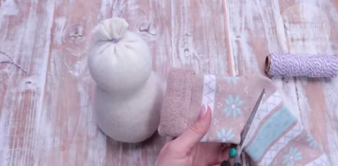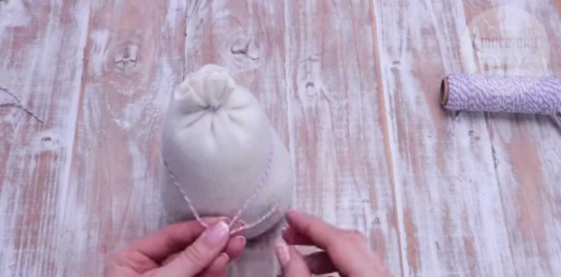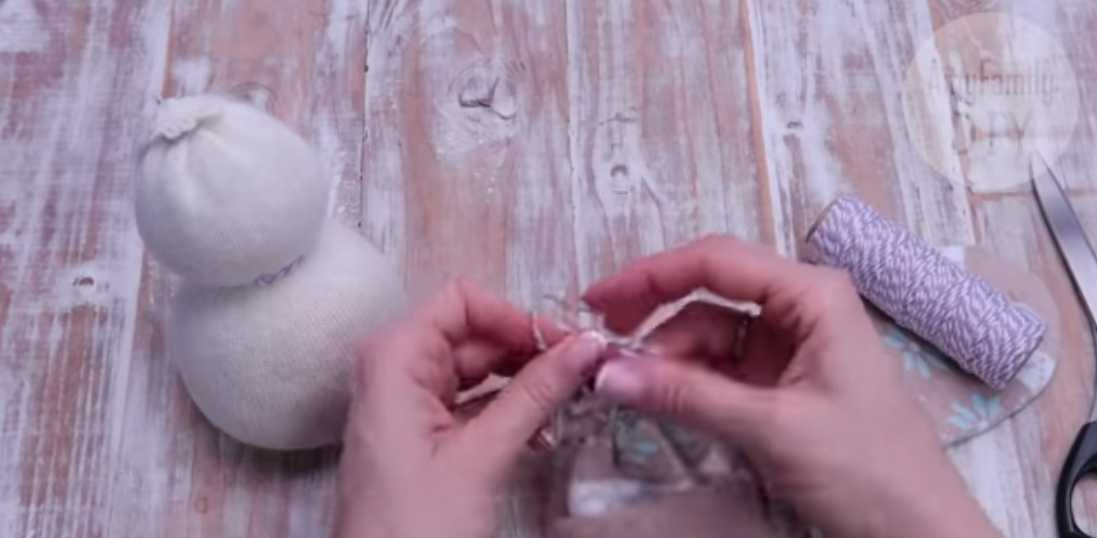 - Заполненный мешочек затягиваем ниткой вверху и там, где у снеговика шея.