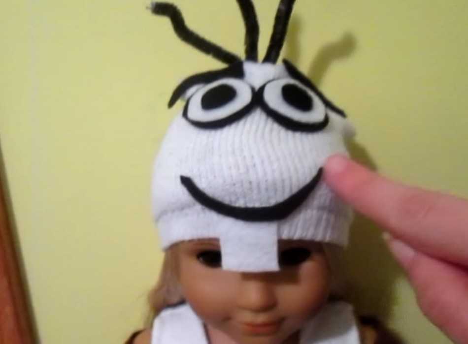 К шапке также нужно добавить широкие мохнатые брови и нос-морковку. Нос в нашем примере пошит из оранжевой ткани, он мягкий. Для костюма снеговика для мальчика пошейте флисовый оранжевый нос и набейте его синтепоном. Наш снеговик — мультипликационный персонаж Олаф, и значит, ему нужен большой белый зуб. Приклейте к шапке и его.