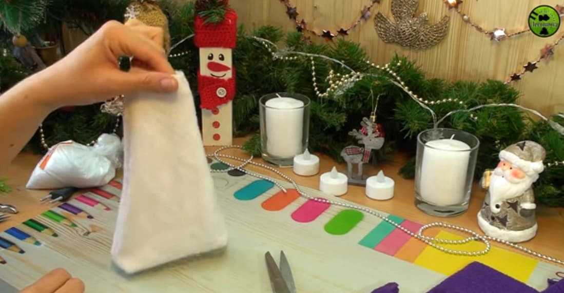 - Белый фетр складывают пополам и прикладывают к выкройки снеговика. Обводят карандашом и вырезают.