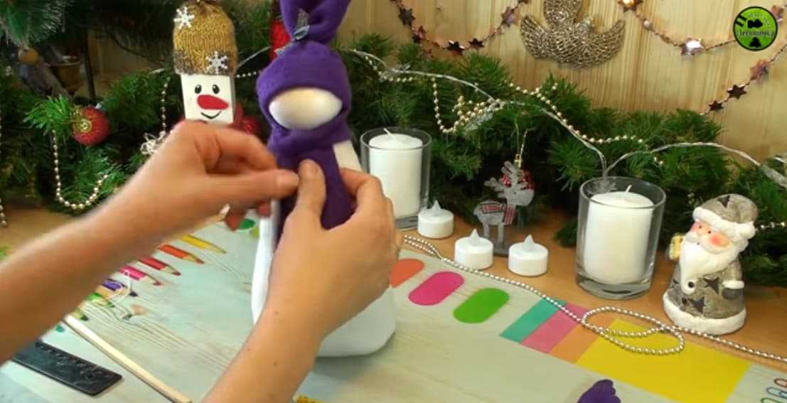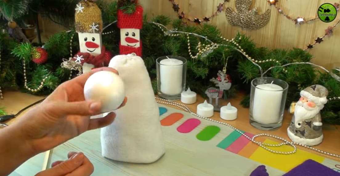Руки и ноги снеговичка освобождаем от резинного шарика и приспосабливаем к телу.