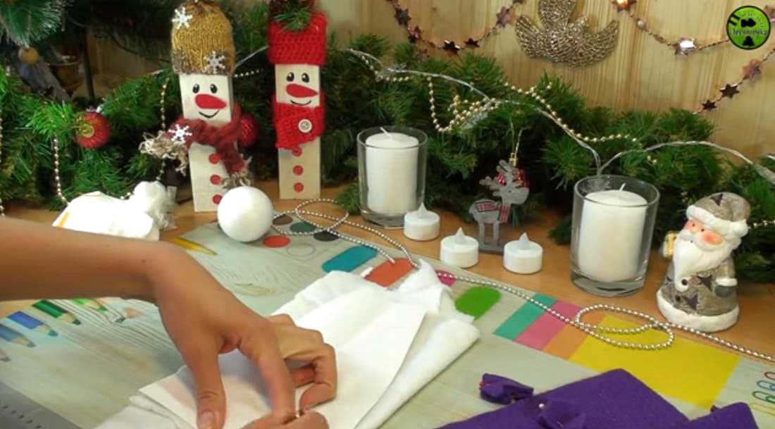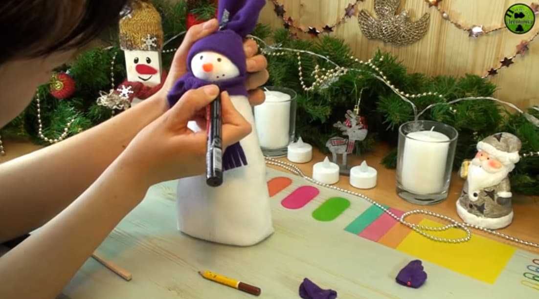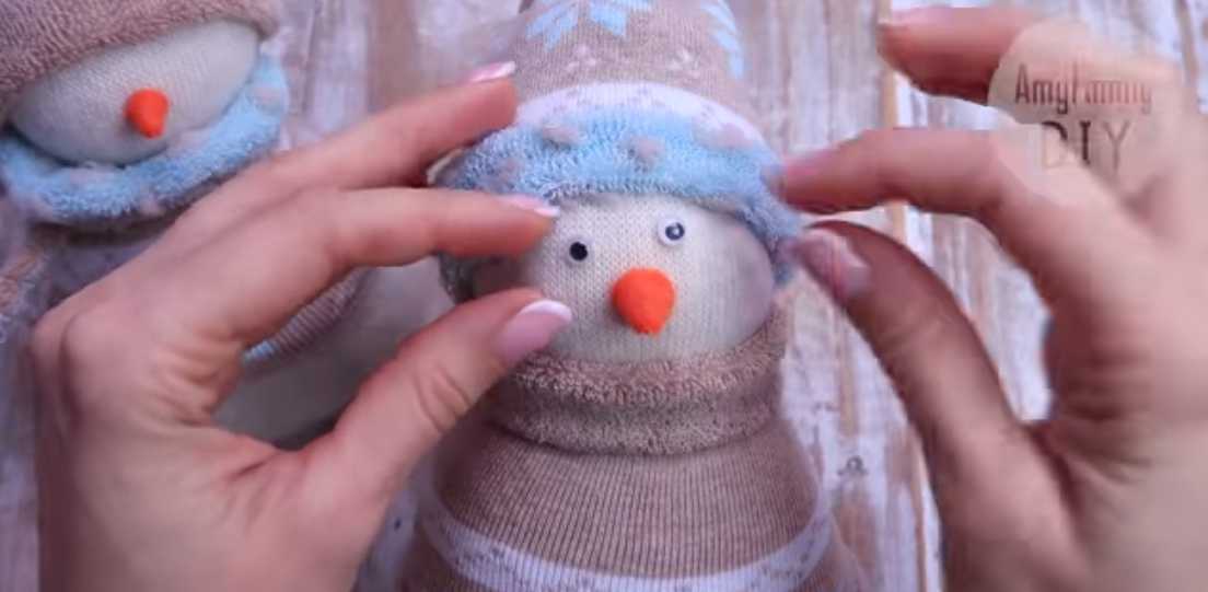 - И опять через внутреннюю часть пришивают носик, делают ручки и ротик снежному малышу.