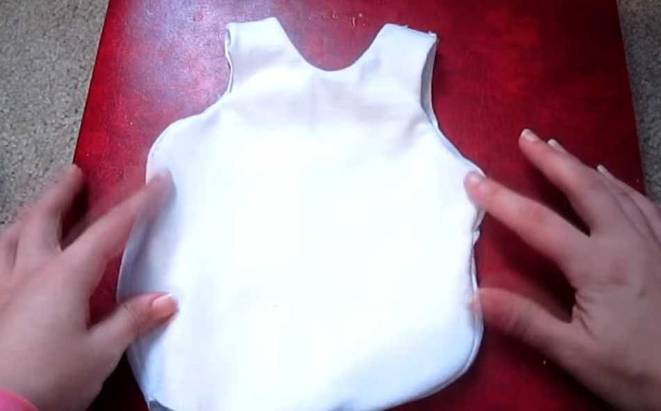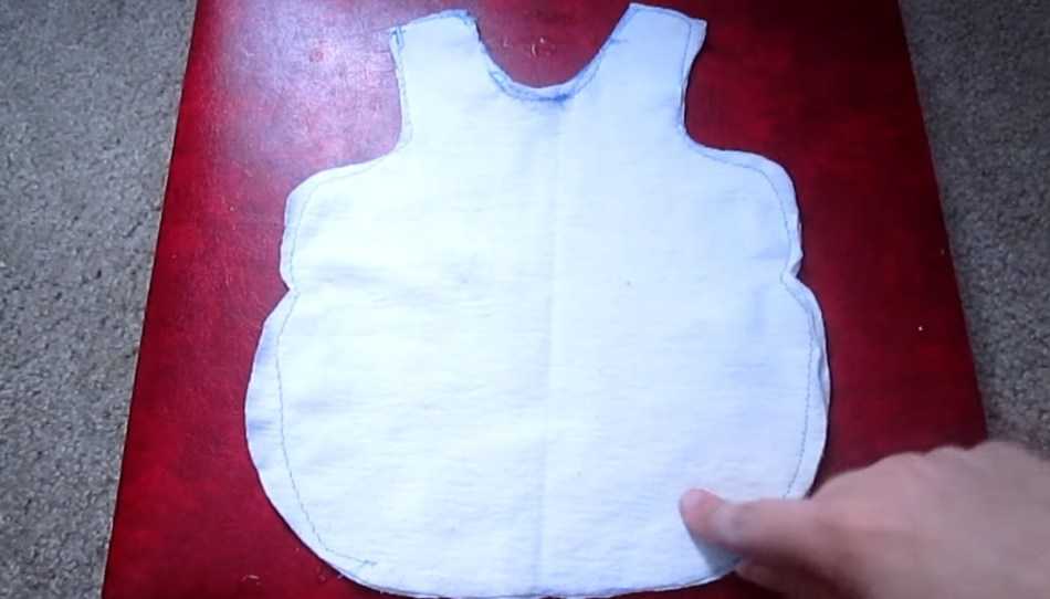 Вначале нужно сшить между собой две части передней детали. Не забудьте оставить часть шва не прошитой, чтобы наполнить переднюю часть новогоднего костюма синтепоном.