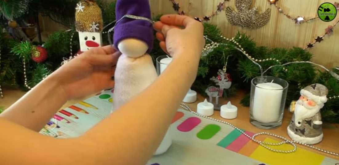 - На верхнюю часть снеговика одевают шапочку и пришивают обметочным швом по кругу, не отрывая нить.
