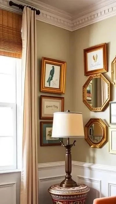 Стиль «Ар-деко»: сочетайте зеркала с геометрическими узорами, латунные подсвечники и бархатные подушки насыщенных цветов (изумрудный, сапфировый). Добавьте винтажные элементы, например, старинный комод.