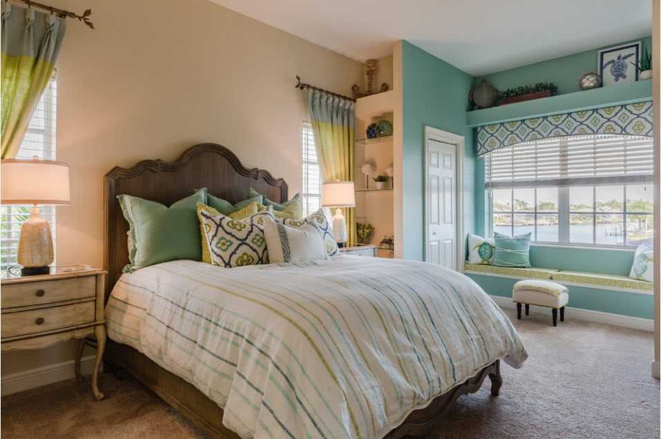 Для оформления спальни используйте пастельные тона. На противоположной от кровати стене: крупные цветы или геометрия на обоях, фотообои с природой или просто контрастный цвет. Над кроватью повесьте картины в эко-стиле.