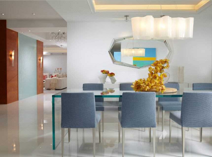 Стол лучше использовать стеклянный, стулья или табуретки должны быть светлые. При помощи подиума, разного напольного покрытия можно визуально разделить пространство, выделить место под спальню.