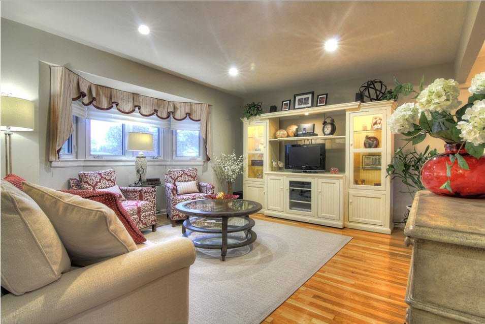 Для визуального расширения площади гостиной одну стену обклеивают яркими обоями с геометрическими узорами, цветами или фигурами животных. Окна вдоль стены занавешивают легкими прозрачными занавесками, которые создадут дополнительный простор. Шкаф устанавливают с зеркальной поверхностью.