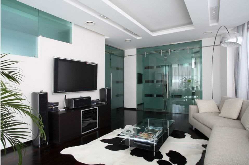 Комната в стиле хай-тек оформляется в сдержанной цветовой палитре с минимумом текстиля и декора