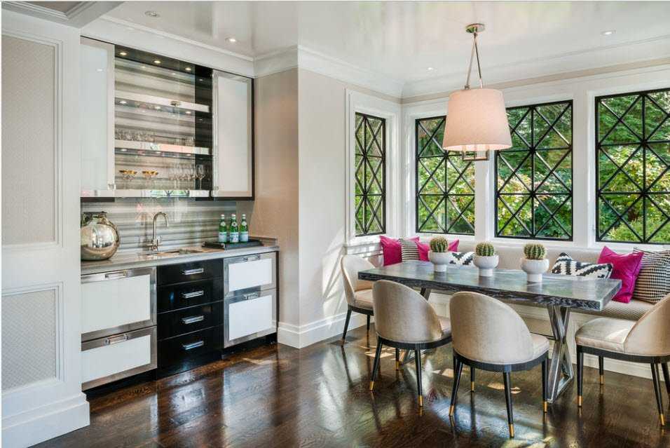 В кухне используется подсветка светодиодной лентой для освещения рабочей зоны, а над барной стойкой, служащей одновременно обеденной зоной и отделяющей зону кухни от гостиной, опускаются изящные стеклянные светильники-подвесы квадратной формы.