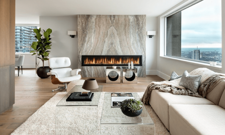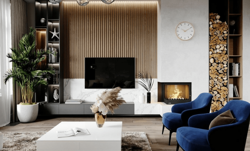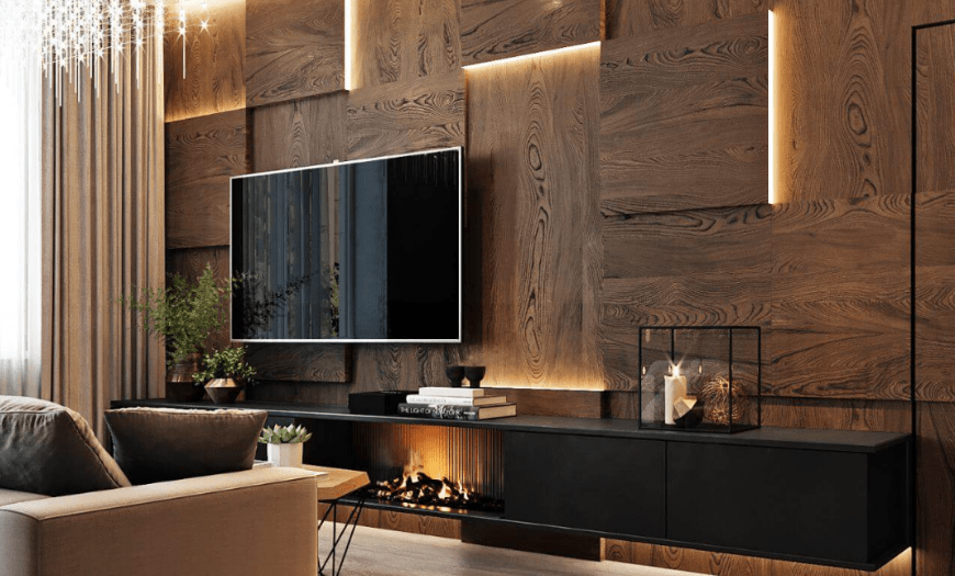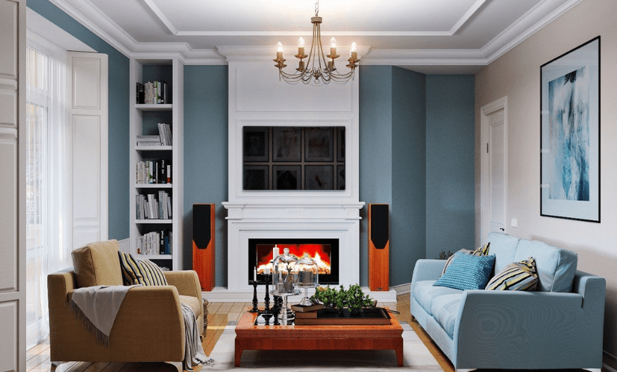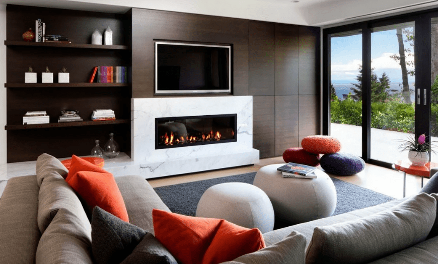 Если площадь и стиль позволяют, то в гостиной размещают камин. Он придаст теплую обстановку. В таком помещении приятно собираться с семьей и проводить время. Камин может быть с огнем (в частном доме) либо с его имитацией.