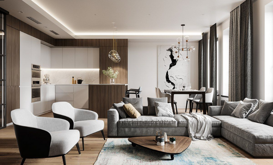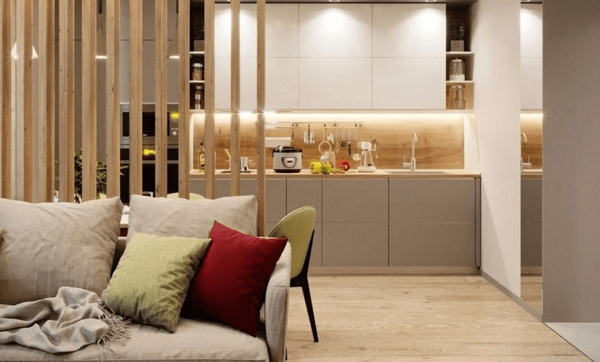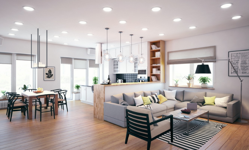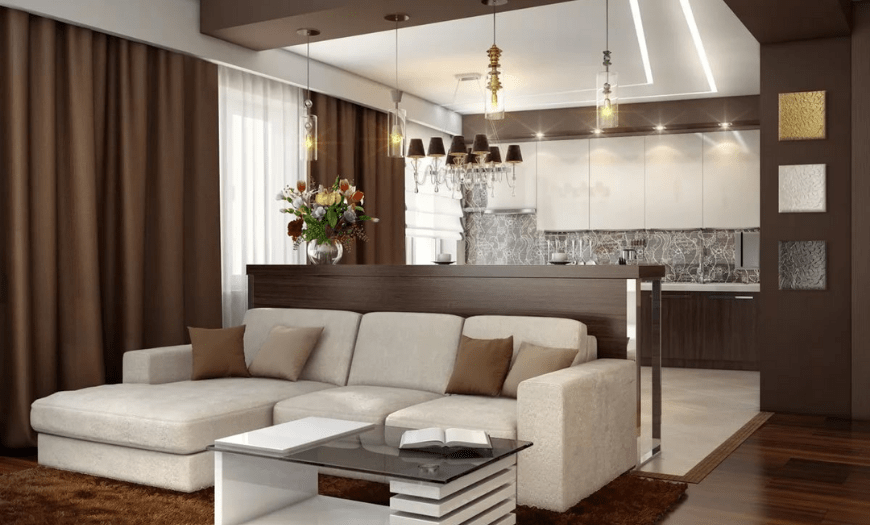 Первый этап – это разделение пространства на разные участки. Зонирование помещения можно создать при помощи освещения, расстановки мебели, монтажа перегородок (переносных и постоянных) и барных стоек, которые разделят гостиную и кухню.