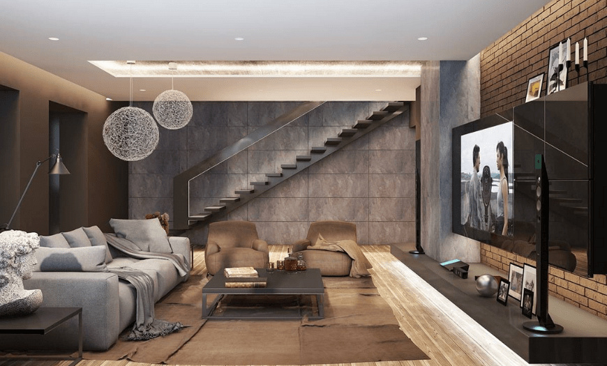 Кирпичная кладка, деревянная отделка и цветовая гамма от бежево-коричневого до графитового. Для потолка лучше использовать светлые оттенки и натяжную конструкцию. Это визуально увеличит высоту помещения и позволит сделать необычную дополнительную подсветку. Одну из стен можно оформить имитацией кирпичной кладки.