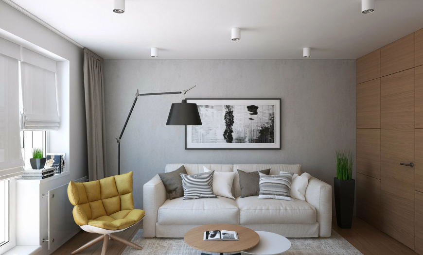 Даже в небольшом помещении верная гамма может создать уютное, визуально большое пространство для отдыха. В этом помогут светлые тона и минимум предметов интерьера.