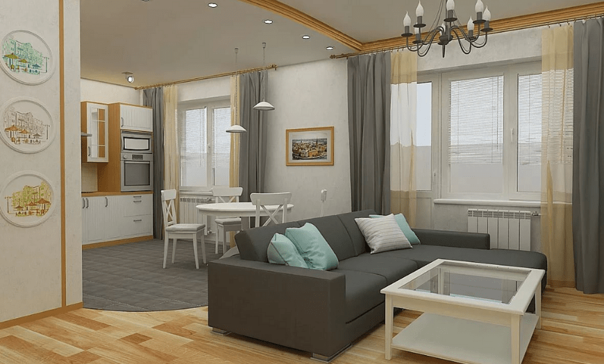 Яркость, стильность, характер достигается с помощью акцентов, декоративных элементов, красивых аксессуаров. Они же помогут за счет подобранного цвета и фактур связать зону гостиной с кухней. Например, цвет кухонного фартука, рабочей поверхности повторяется в диванных подушках, ковре. Создать единое пространство позволяют современные материалы напольного покрытия: совпадающий по цвету и фактуре рисунок ламината, паркета основной зоны и керамогранита для кухни.
