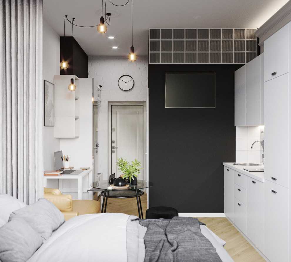 На фото квартира-студия с компактной кухней, расположенной в углублении