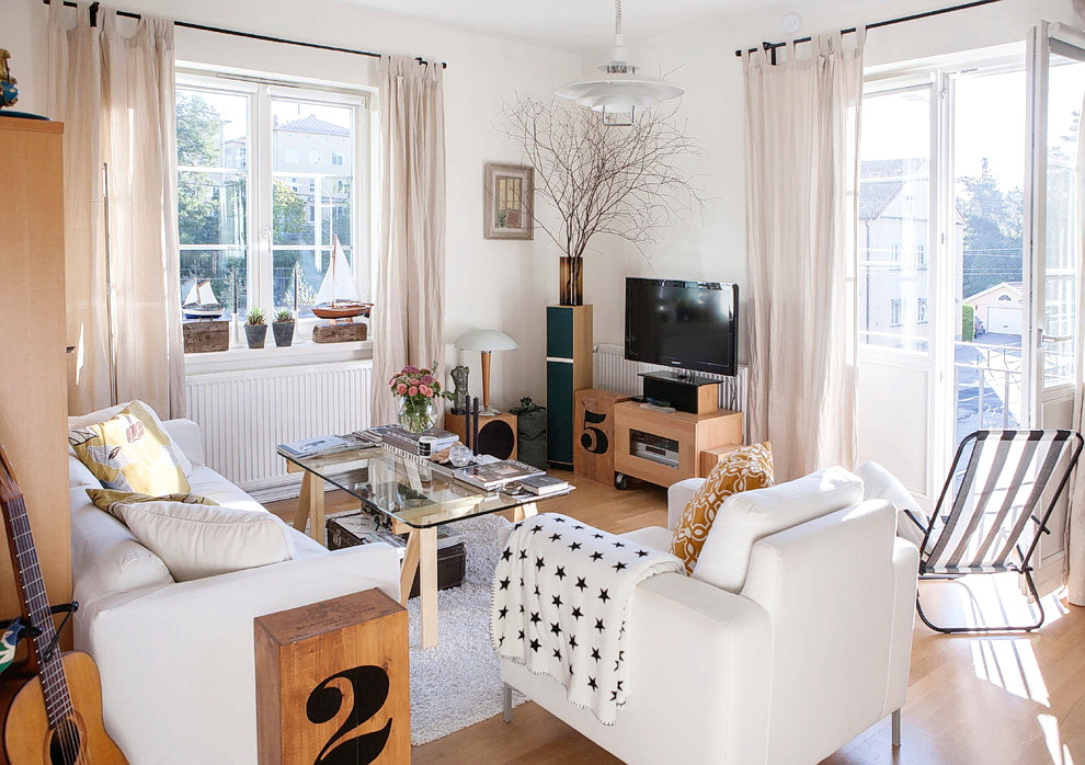 Характерными чертами скандинавского интерьера можно считать большое количество естественного света и обилие текстильных элементов из натуральных тканей. Это шторы, мягкие подушки, скатерти и пр. Популярно использование большого количества домашних растений. Зеленый цвет заметно освежает тусклый белый интерьер.
