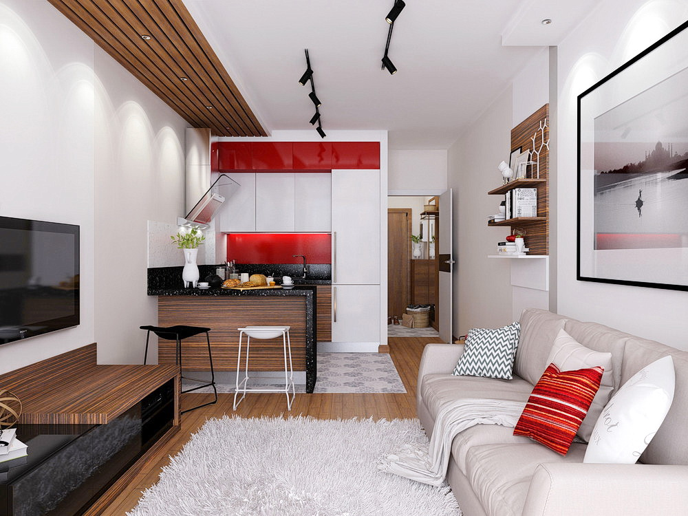 В кухне пространство нужно использовать с максимальной «экономией». Поэтому кухонный гарнитур должен быть компактным, но включать вместительные отделения. Подойдет прямой гарнитур, устанавливаемый вдоль одной стенки. Рядом с ним нужно расположить холодильник. Вдоль противоположной стенки (в углу возле окна) разместится обеденная зона, включающая столик и аккуратные табуреты (стулья). По возможности стенку между кухней и жилой комнатой следует заменить барной стойкой. Тогда свободного пространства для готовки станет больше. При этом установленный рядом со стойкой диван, размещенный на противоположной стенке телевизор (в спальне-гостиной), помогут хозяевам и их гостям комфортно проводить время за просмотром футбольных матчей, фильмов.