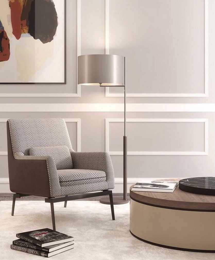 Искусственные источники света не выставляются напоказ, а выполняются в виде скрытых софитов или потолочной подсветки. Можно использовать геометрической формы торшеры или настольные лампы.