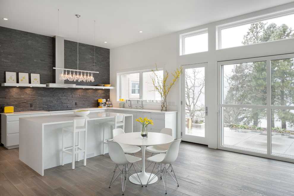 В свободном пространстве взгляд ищет, за что зацепиться, поэтому, выбирая светлые стены, позаботьтесь о других контрастных деталях. Дизайнеры рекомендуют использовать бетон, фактурные деревянные плитки, стеклянные и металлические панели.