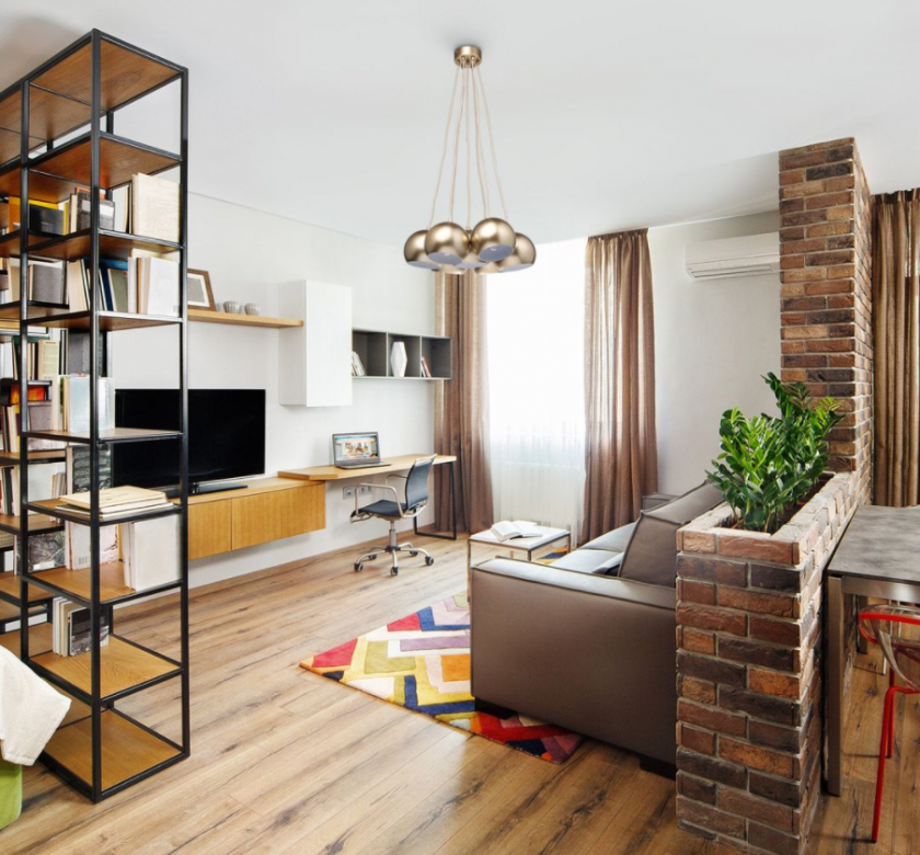 - Альтернативой стен могут быть арки или колонны. Оригинально будет смотреться модульная мебель, или же перегородки на основе дерева или текстиля. Зонировать помещение можно барной стойкой.
