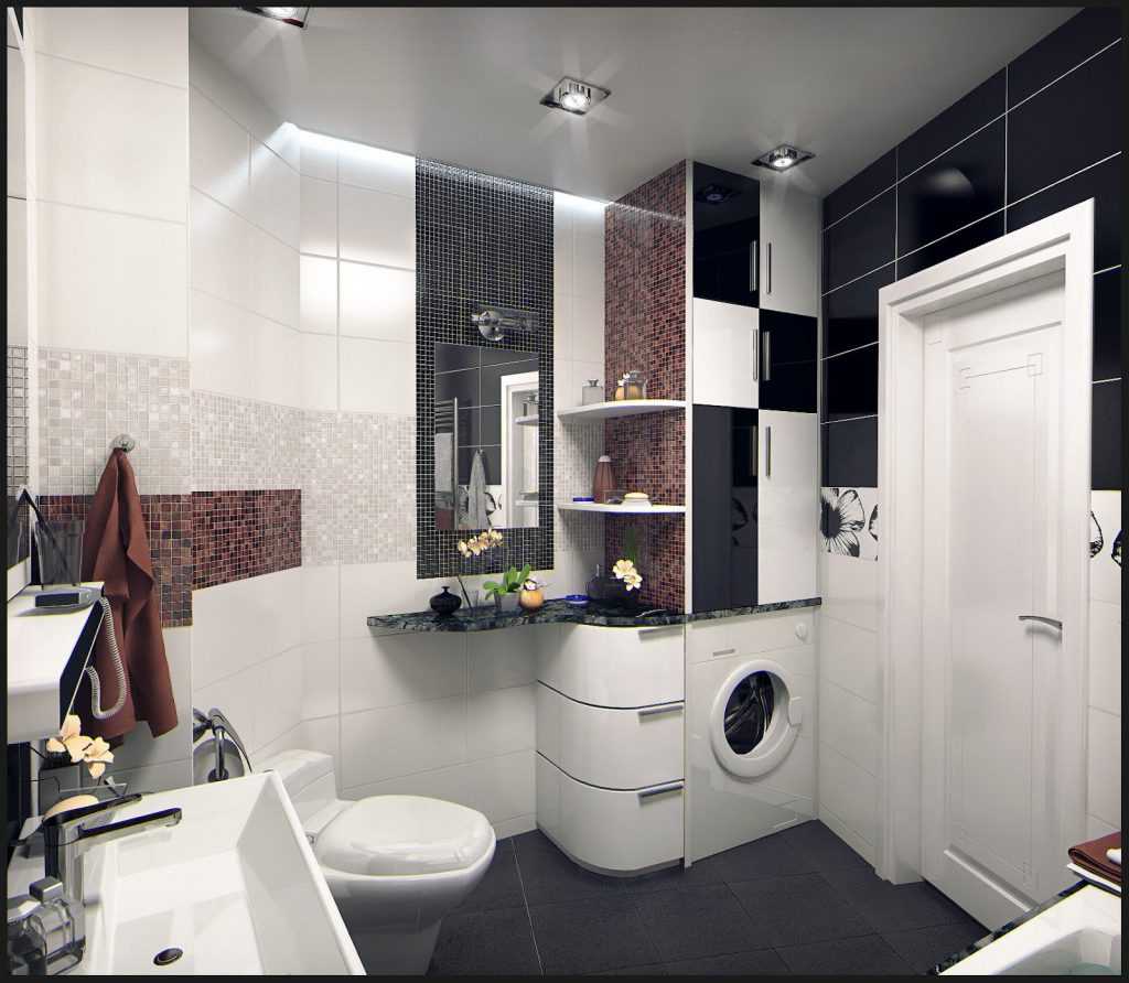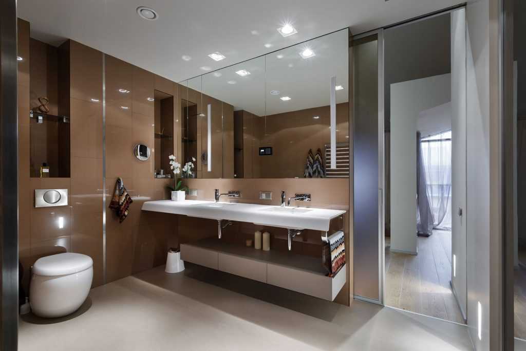 Ванная, раковин, унитаз, биде должны быть подвесными, а коммуникации скрыты коробами под облицовочным покрытием. Это веяние дает возможность применить современные сантехнические детали, формы которых округлые и изящные.