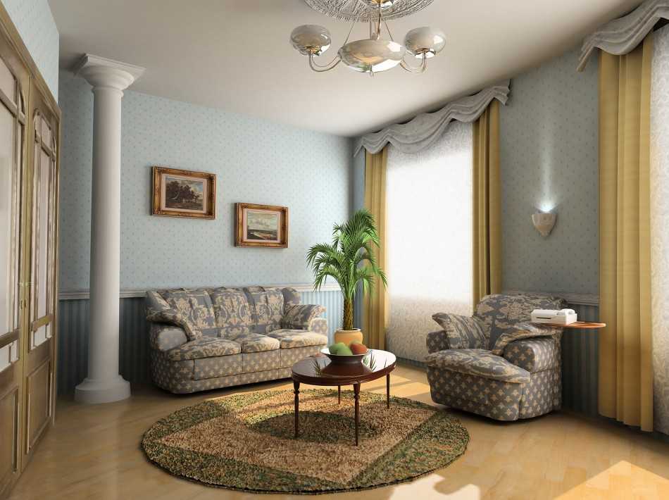 окна украшают массивными шторами насыщенных оттенков. Отлично смотрится сочетание тонких шелковых гардин и французских штор. Искусственное освещение обеспечивается массивной люстрой в центре потолка, вычурными светильниками;
