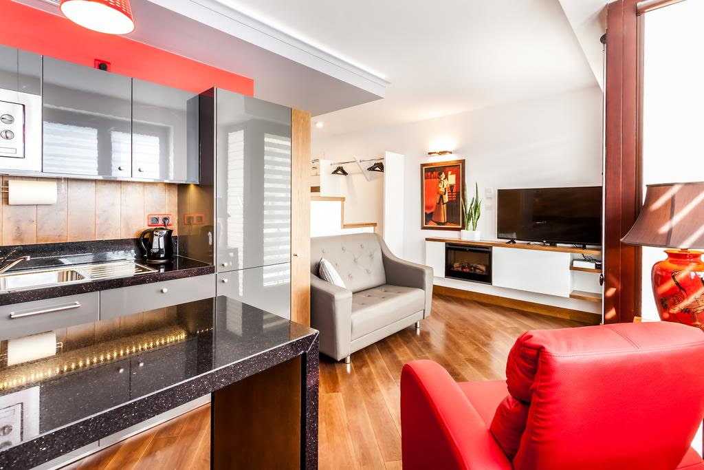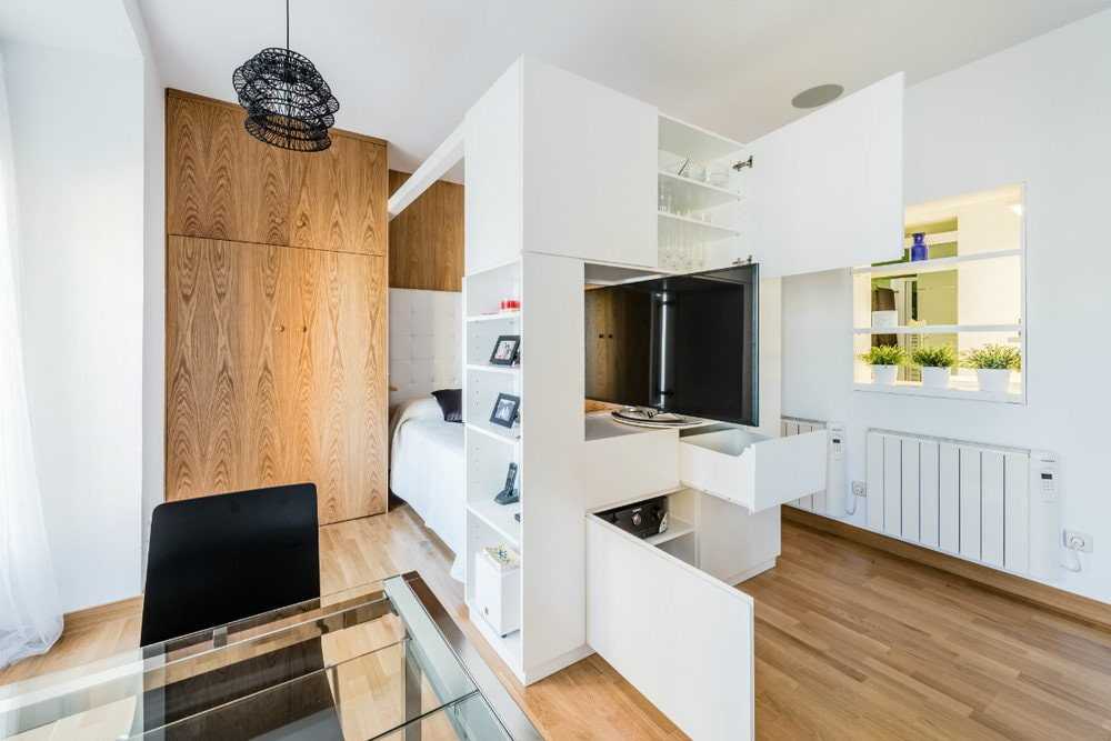 В этом проекте дизайна крошечной квартиры гарантируется создание комфортного жилого пространства для более чем одного человека — использование света, наличие нескольких зон для посиделок и отдыха. Поистине уникальный дизайн предлагает много возможностей для приятного проживания. Конструкция из светлого дерева добавляет легкости и динамичности стилю в небольшой городской квартире. Необычное использование пространства, направленное на увеличение места для хранения вещей за диваном, также можно применить по отношению к столу или кровати.