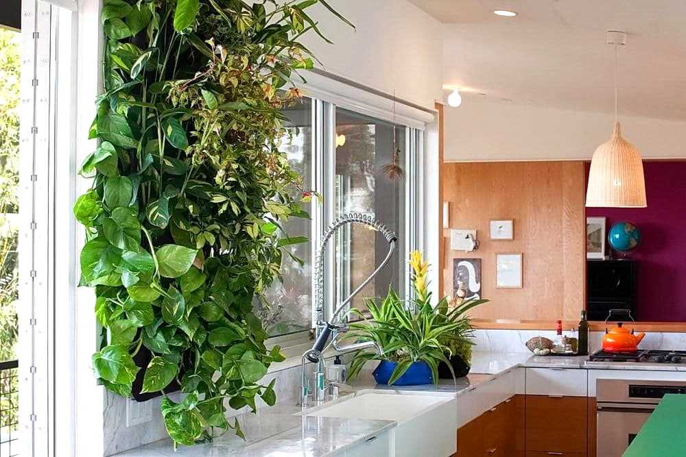 Живая стена в интерьере кухни будет отлично смотреться, если посадить на ней различные пряные травы или кулинарную зелень.