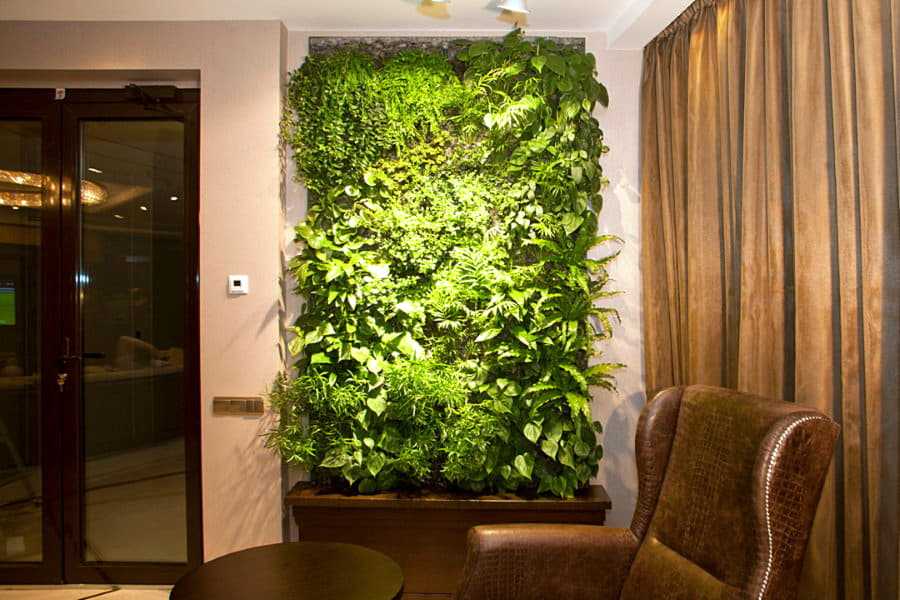 Растительные конструкции на стене снижают фоновый шум извне, что особенно актуально для городских квартир в шумных, загруженных транспортом, кварталах.