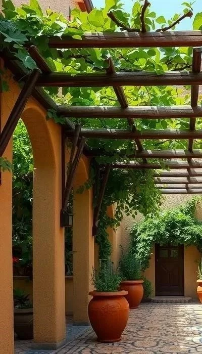 Для создания тени используйте перголы, увитые вьющимися растениями – глицинией, виноградом. Они не только защитят от солнца, но и украсят двор.