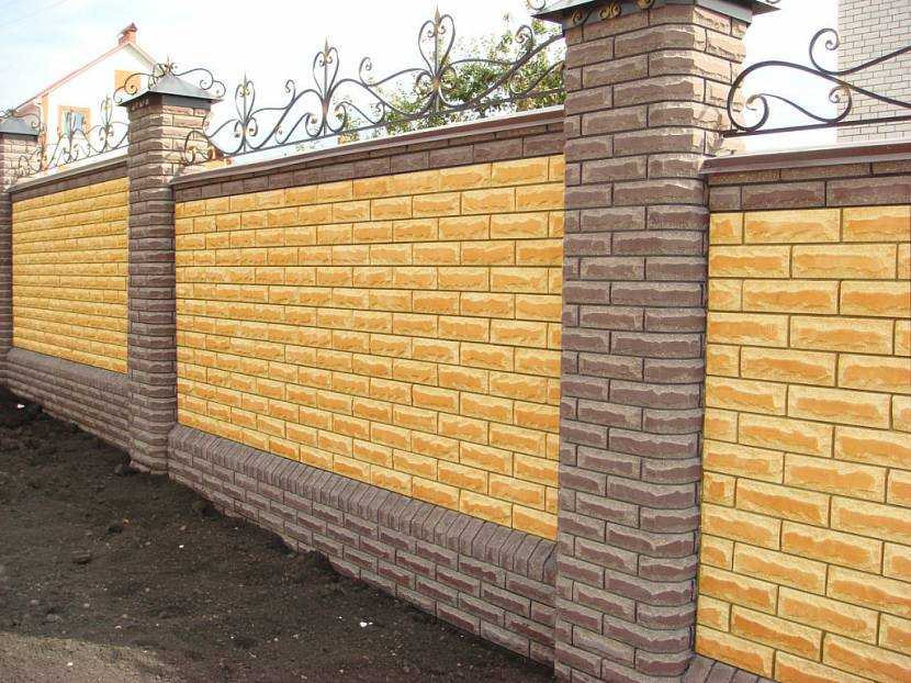 Эти два отлично сочетающихся цвета можно использовать в разных вариантах декорирования. Наиболее популярный вариант — это оформление цоколя и опор коричневым кирпичом и строительство пролетов с помощью желтого кирпича. Так как цена на облицовочный кирпич значительно выше обычного, то обойдется такое ограждение недешево.
