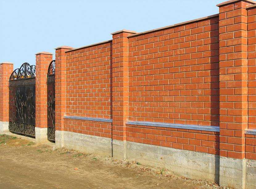 Кирпичные заборы с облицовкой – это один из экономичных вариантов. Для их строительства используют б/у кирпич, а для придания сооружению эстетичного вида применяют различные облицовочные материалы.