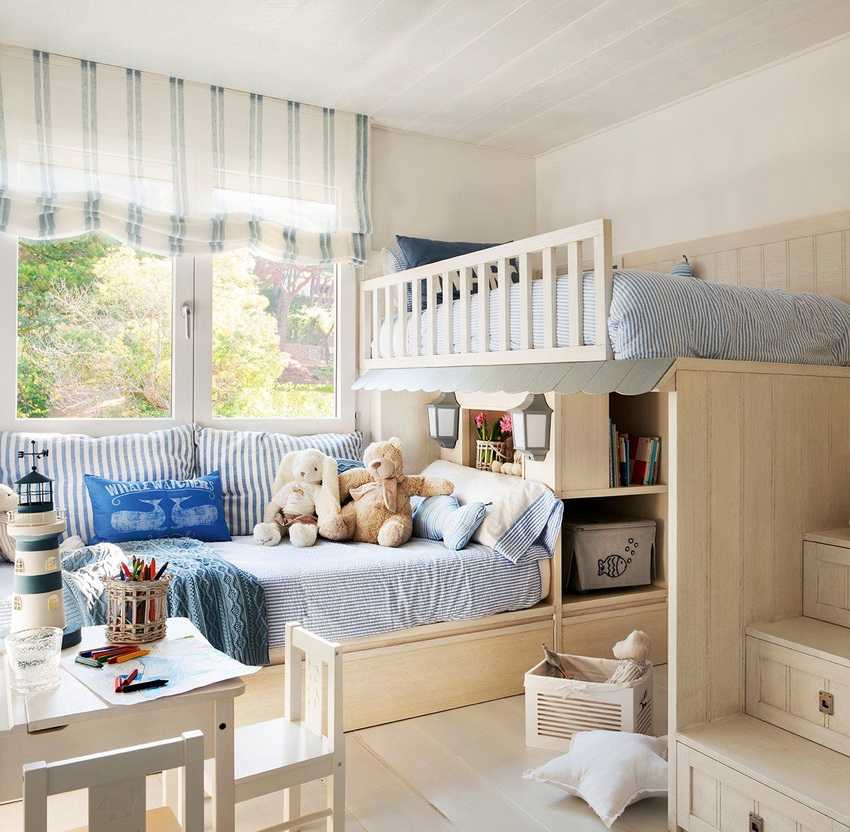 Еще одна альтернатива — шторы. Их легко установить, они не занимают много места, но при этом ткань является отличной перегородкой и подходит даже для разнополых детей. К тому же, занавески не имеют острых углов и удар о них во время активных развлечений не сулит ничего серьезного.