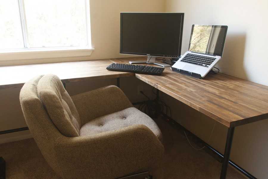 Кроме прямоугольной «классики», в каталоге попадаются и столы угловой формы с делением на активные площади. Такие столы отлично впишутся в небольшие комнаты.