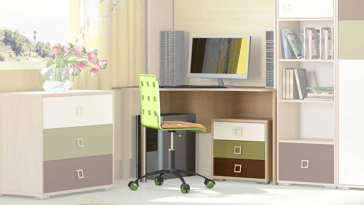 Стол нужно укомплектовать шкафчиками и полками, а самое главное стулом. Он, как и стол, должен соответствовать росту и возрасту ребёнка. Для удобства и облегчения нагрузки, действующей на спину ребёнка, стул должен быть со спинкой. Лучше всего подойдут мягкие варианты.