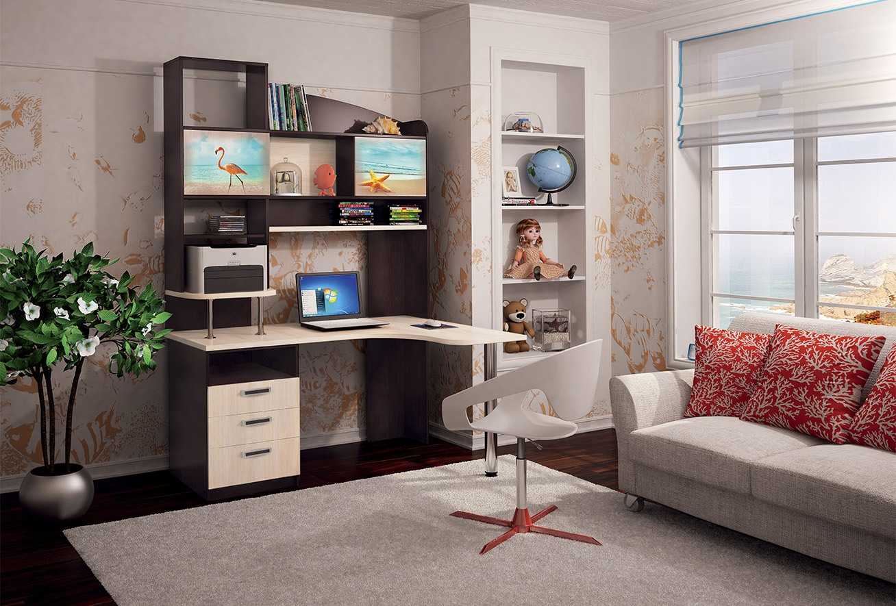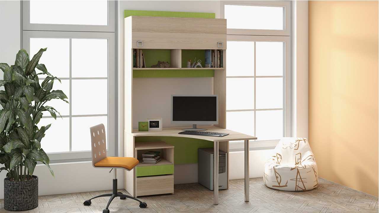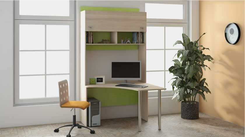Угловой письменный стол – подходящее решение для однокомнатной квартиры. Он дает возможность без лишних затрат создать уголок школьника для сына или дочери. Модель с надстройкой считается наиболее практичным вариантом.