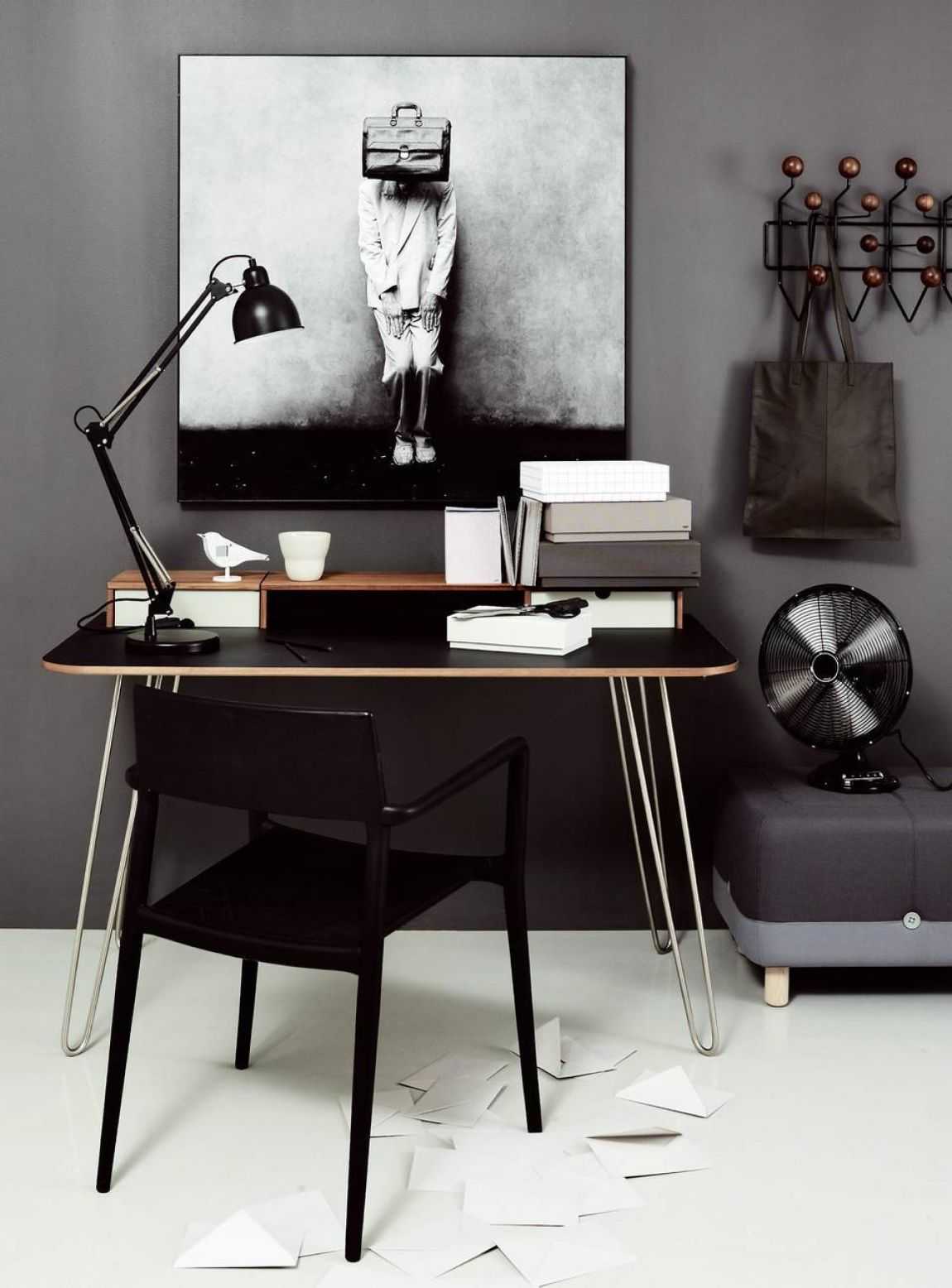 Стандартный, по форме напоминающий школьную парту стол. В целом, если размеры стола не слишком громоздкие, он вполне может подойти для любой комнаты.