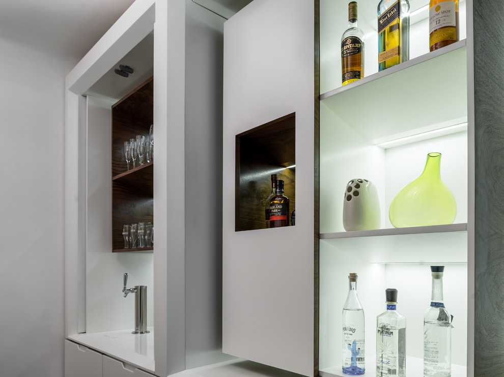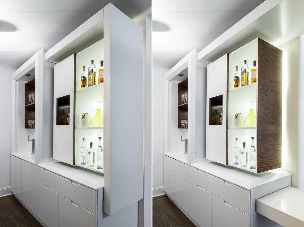 Его хозяин хотел, чтобы в квартире появилось место, где он сможет проводить время со своими друзьями. Главная хитрость в том, что боковая стена шкафа вытягивается и получается небольшой столик, а рядом стоящий невысокий комод из массива ореха заменяет стулья.