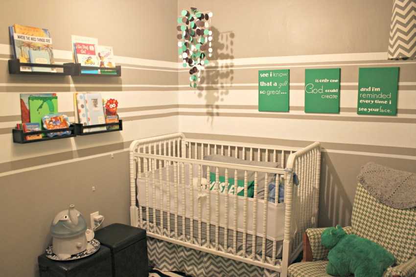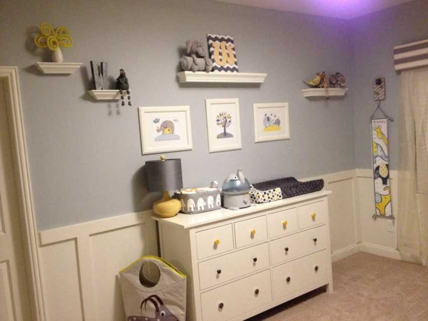 - Оформление стен. В игровой (спальной) зоне малыша для стен лучше использовать другие материалы ярких цветов. Отлично смотрятся фотообои или роспись у кроватки.