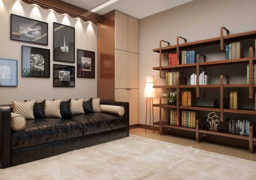В большой гостиной стеллаж-перегородка – отличная идея ее разделения на зону отдыха и рабочий кабинет. В такой планировке можно удобно и доступно поместить все необходимое для работы – книги, бумагу, справочники, диски и другие принадлежности.