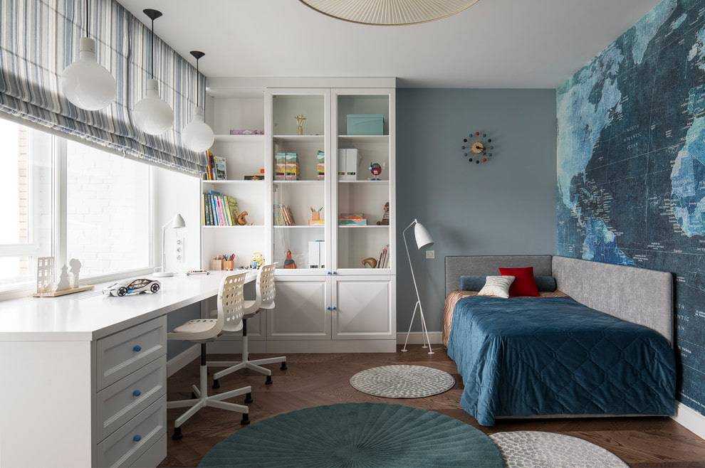 На фото детская в скандинавском стиле с письменным столом в сине-белых тонах.