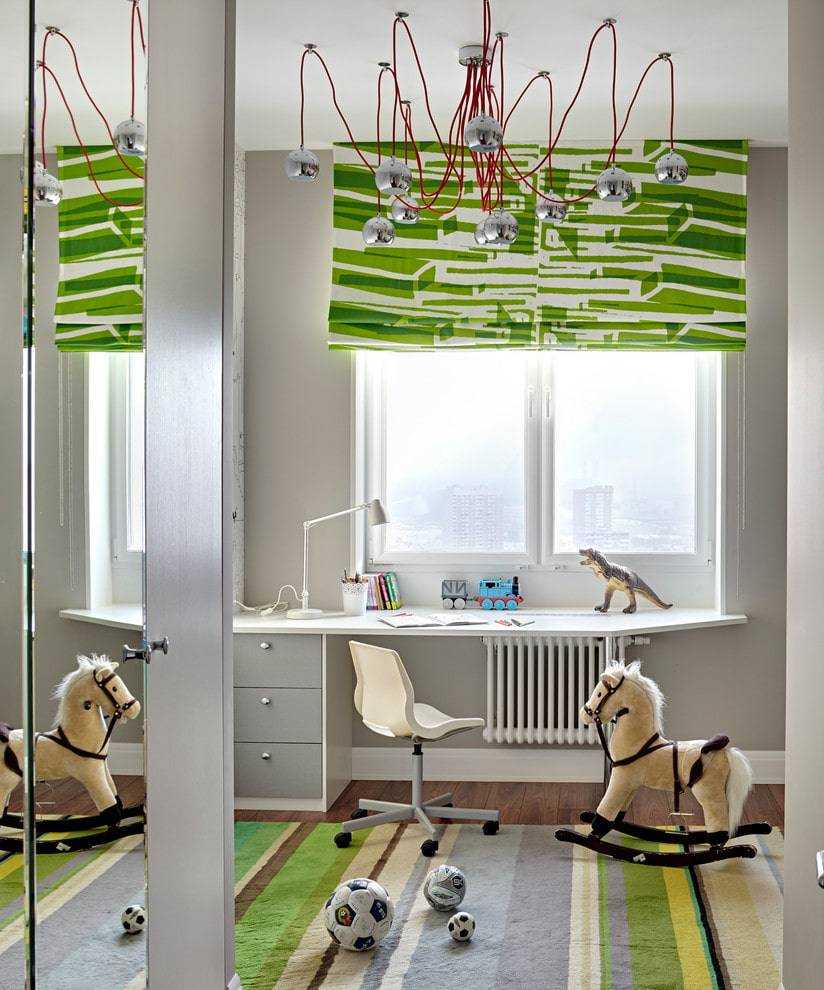 Чтобы поставить длинный стол вдоль окна, нужно провести замеры и решить, не будут ли батареи упираться ребёнку в ноги. Если такая вероятность существует, лучше заказать широкую столешницу или подоконник.