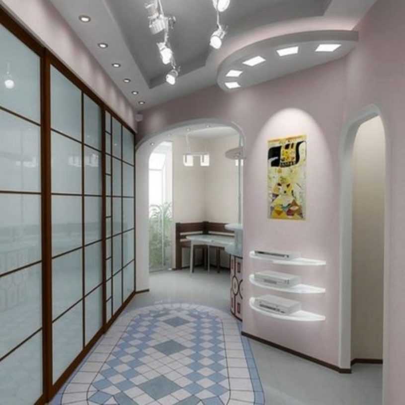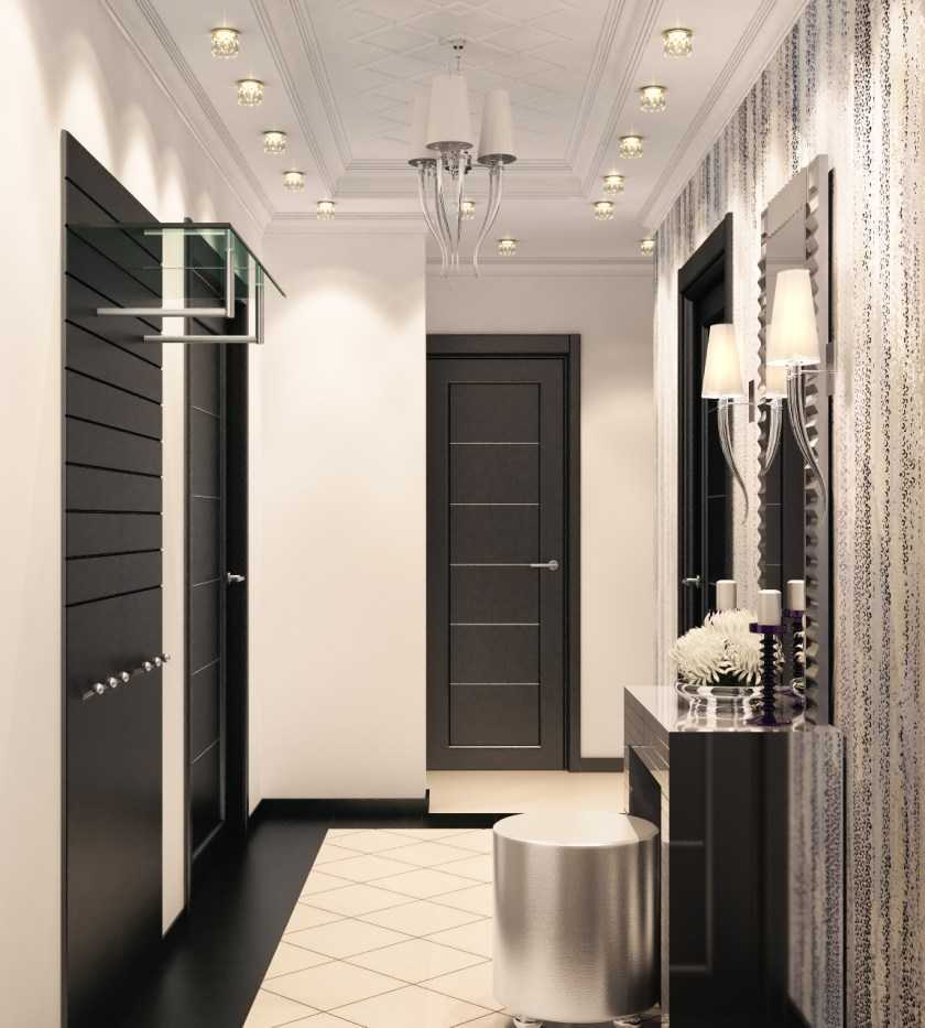 Коридоры в таких квартирах чаще всего имеют совсем крошечные размеры и низкие потолки. Расширить помещение смогут светлые тона, глянцевые поверхности и направленный в разные стороны (в том числе и на потолок) свет. Кроме того, великолепным вариантом для освещения здесь станут потолочные фальш-окна. А вот гипсокартонных конструкций здесь желательно избегать, потому как они пространство скрадывают.