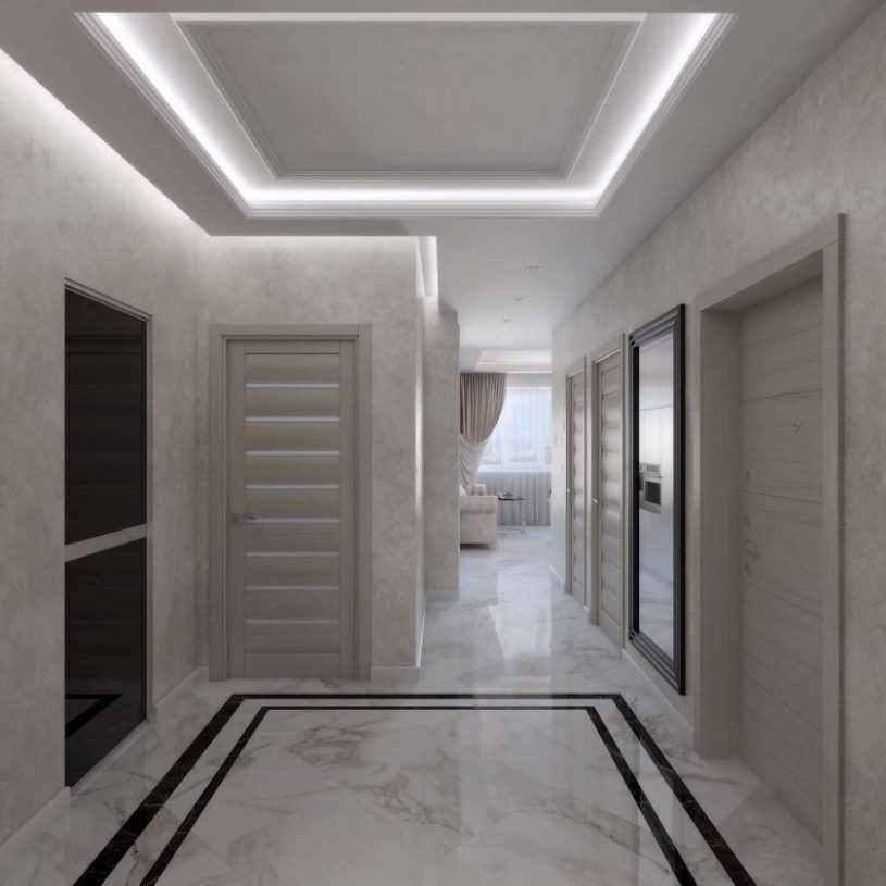 Такая геометрия коридора – идеальное пространство для дизайна, в котором нет ограничений для фантазии! Здесь можно себе позволить любые вариации отделки, цвета и освещения. Причем чем больше помещение, тем сложнее и динамичнее должна быть конструкция потолка.