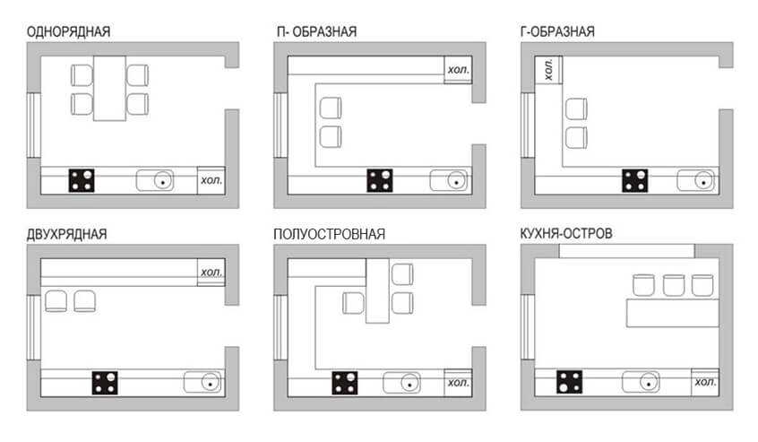 Поговорим немного про общие принципы расположения кухонной мебели. Есть шесть вариантов современной планировки: