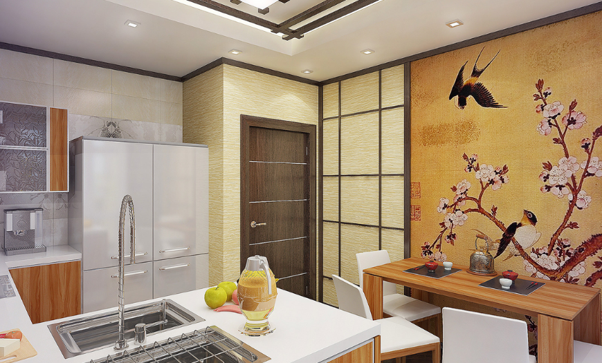 Например, в кухне можно поклеить обои с флористическим принтом или воплотить этностиль с характерным узором в отделке стен, фартука или текстильном оформлении (шторы, чехлы, полотенца и т.д.).