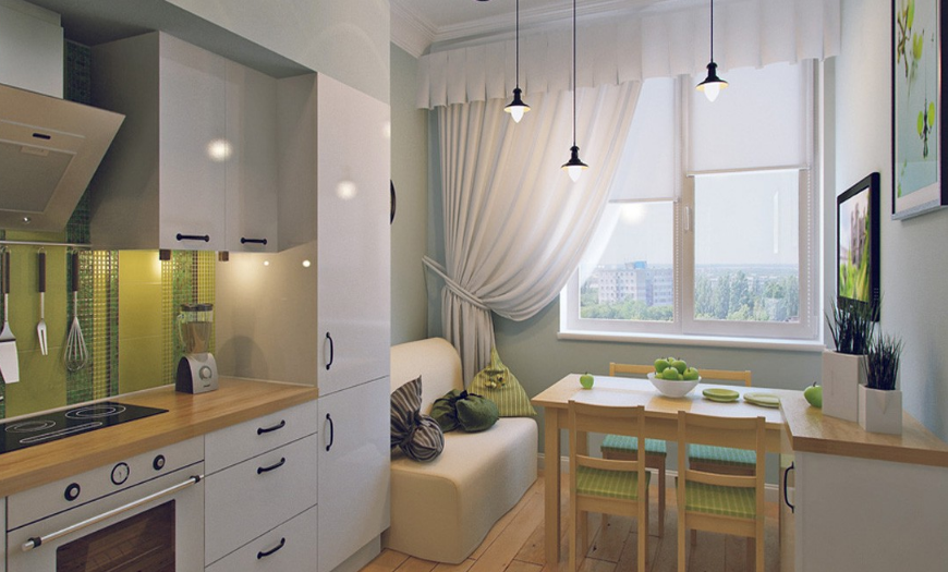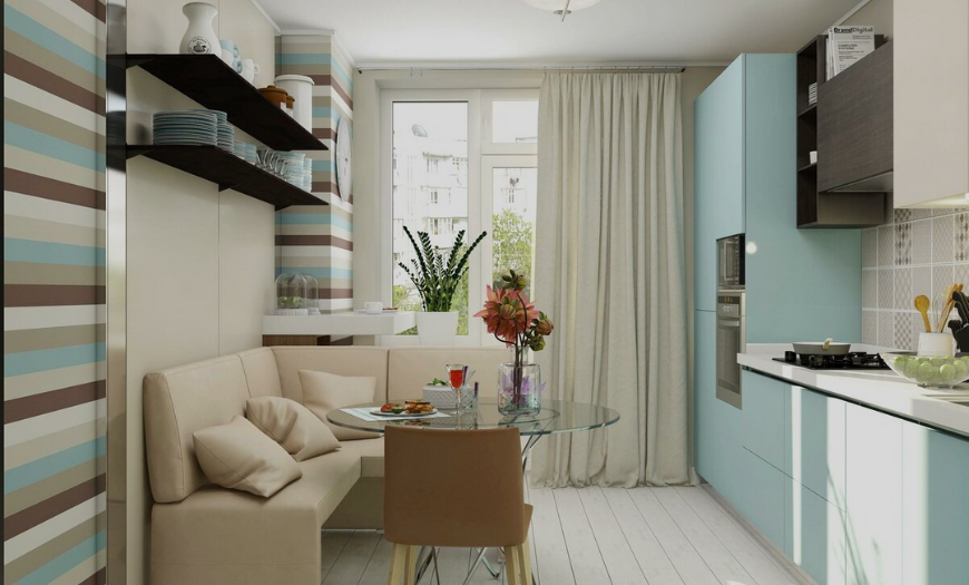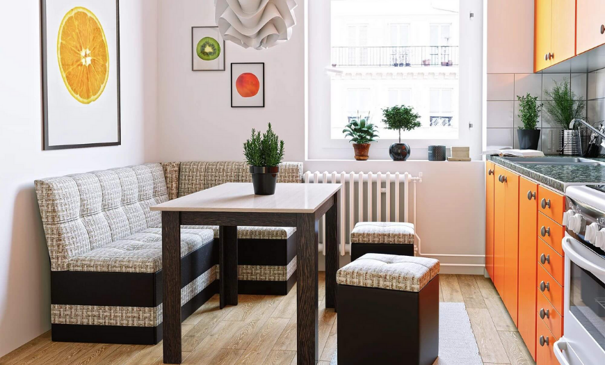 В малогабаритное помещение 9 кв м органично впишется маленькая модель диванчика с практичным спальным местом. Данная конструкция рационально использует квадратные метры и превращает кухонное пространство в дополнительное уютное место отдыха.