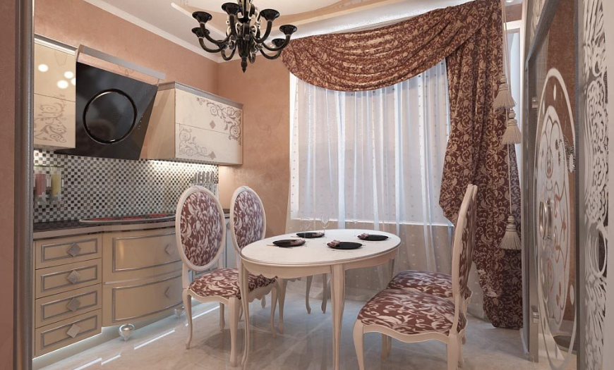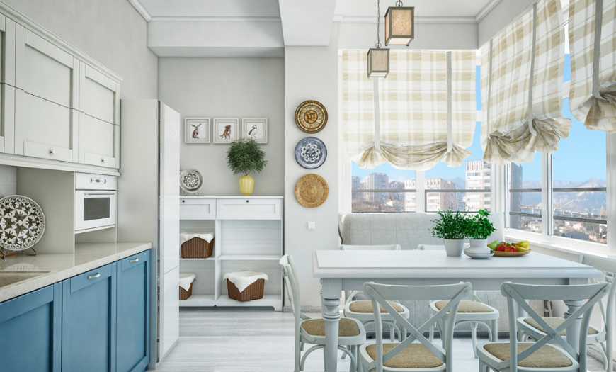 Шторы, настенные декоративные элементы, салфетки и полотенца подбирают в такой же цветовой гамме или наоборот создают с их помощью яркие контрастные акценты. Занавески — короткие, драпировка и ламбрекены исключаются.